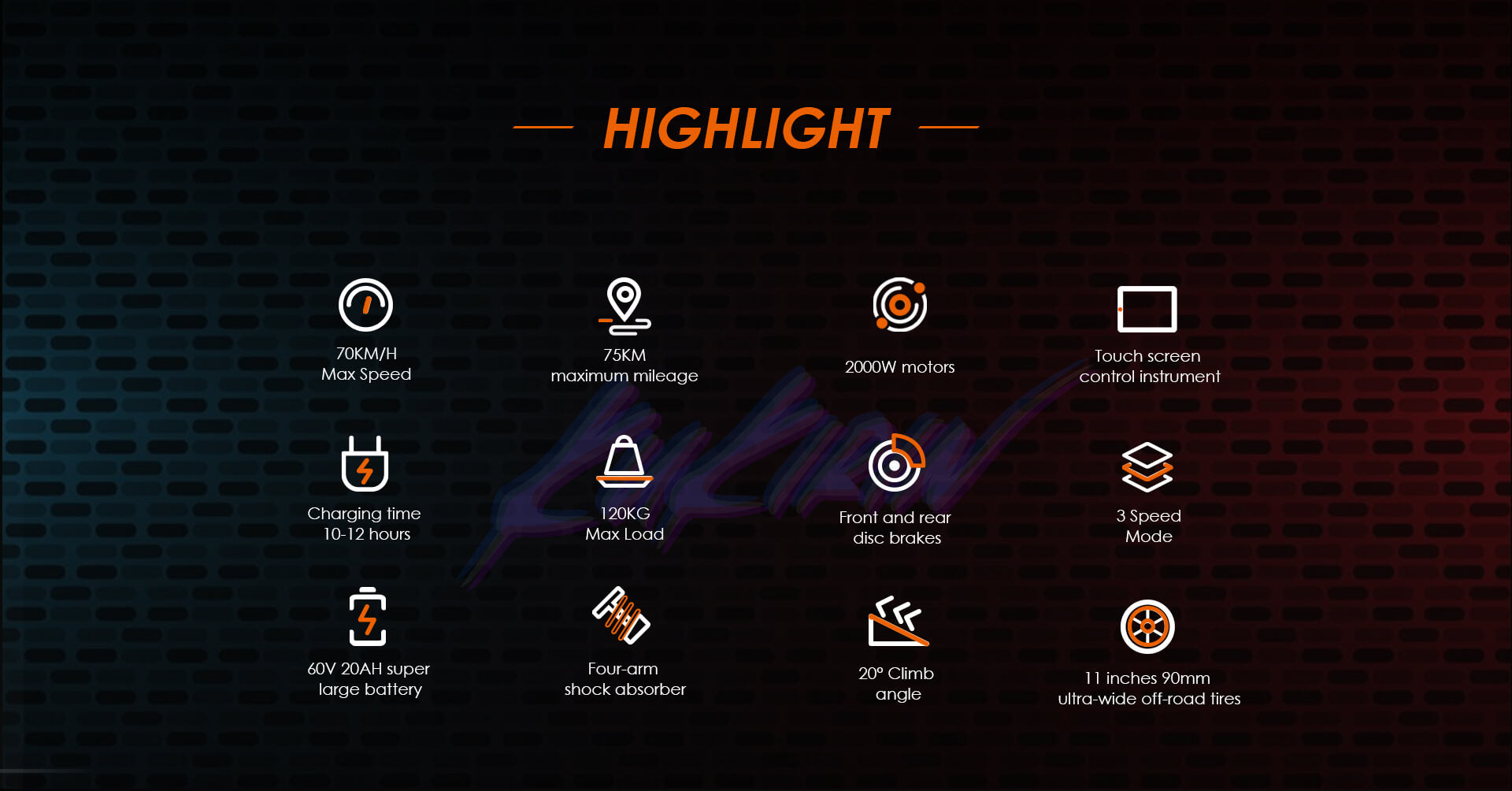 🚀 MOTOR ULTRAPOTENTE DE 2000W – Siente la adrenalina con su motor brushless de 2000W y 60V, capaz de alcanzar una velocidad máxima de 70 km/h y subir pendientes de hasta 20° con facilidad.